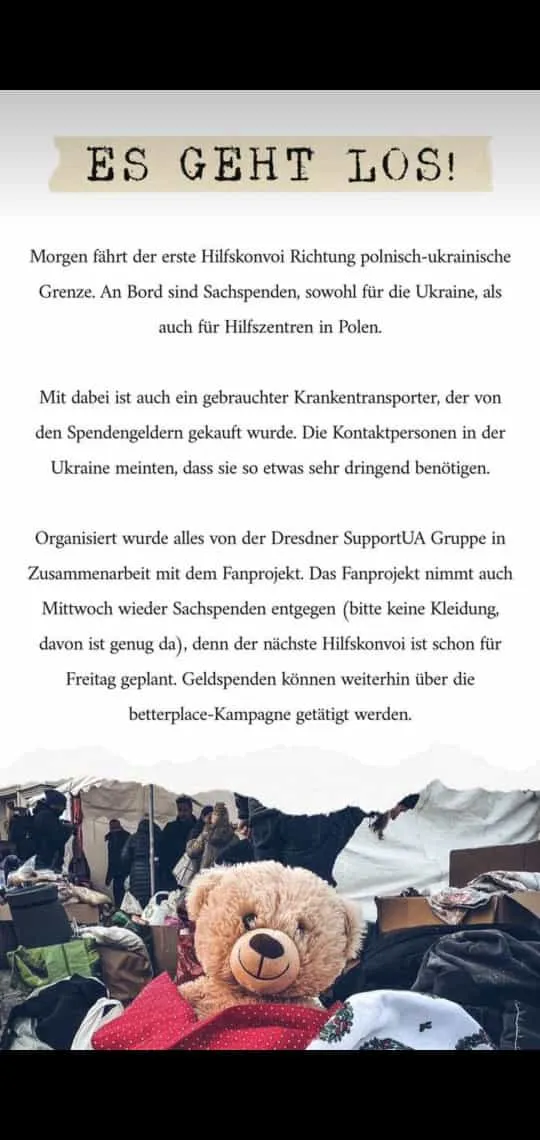 Die alten Nutzer des DFF Massa und Goju sind an der Grenze Polen / Ukraine (Przemysl) und helfen dort Freunden, Frauen sowie Kindern über die Grenze zu bekommen. Pulce hat analog dazu eine Geldsammelaktion über paypal gestartet. Das Geld kommt hundert pro an und wird für Essen, Benzin, Übernachtungen und Schmiergeld etc. verwendet.